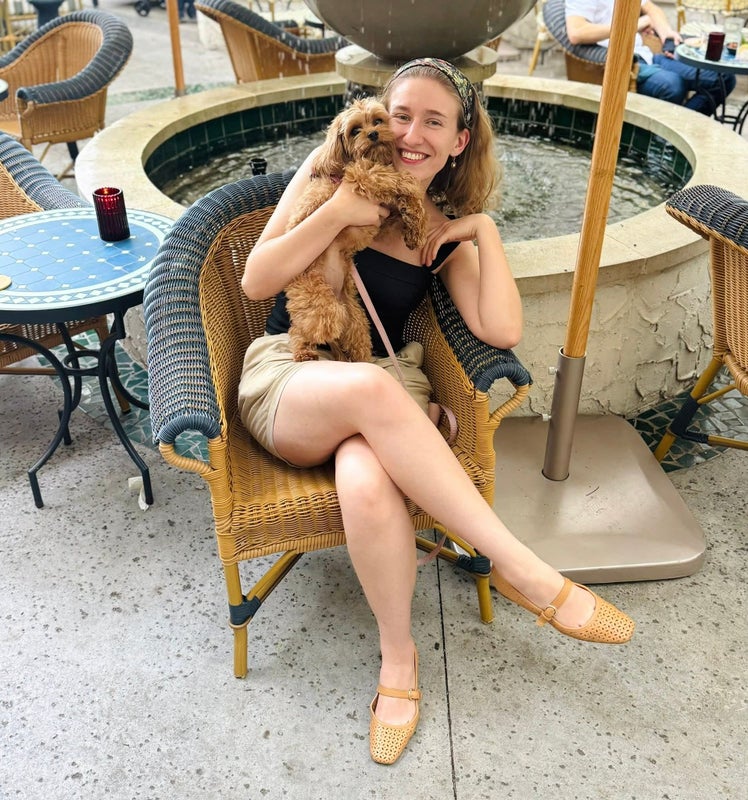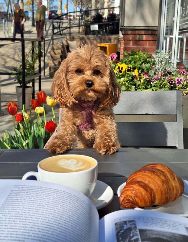 Zelda (3.6 kg, 2 years old) is a small, non-shedding Cavapoo who enjoys chickpeas, outings (either walking or being carried in a tote bag), and cuddling. She'll probably love London and will definitely love new friends.