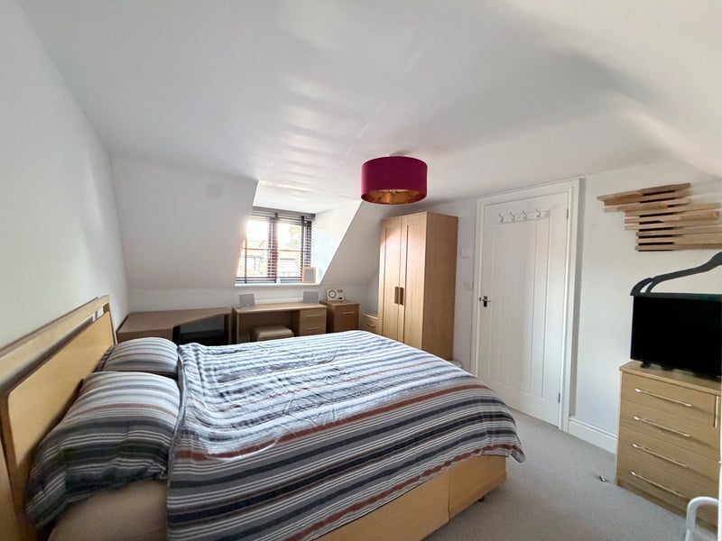 The room is a very large double (circa 15’ x 13’), is fully furnished with double storage bed, pc desk, vanity desk, wardrobe, additional hanging / drawer storage and TV.