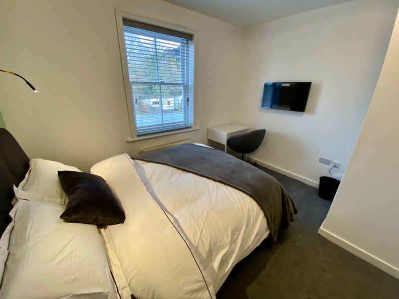 • Double bed with reading lights, wardrobe, desk, chair, wall mounted Smart 32" TV