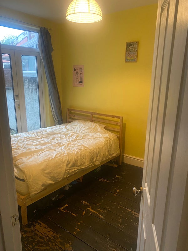 Maelle is leaving so we’re looking for someone to take over her room. The room is partly furnished with a bed and some shelves. The room has a door that leads to the garden