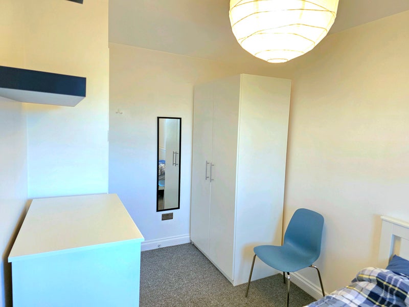 The room is a double, complete with a wardrobe, chest of drawers and shelves.