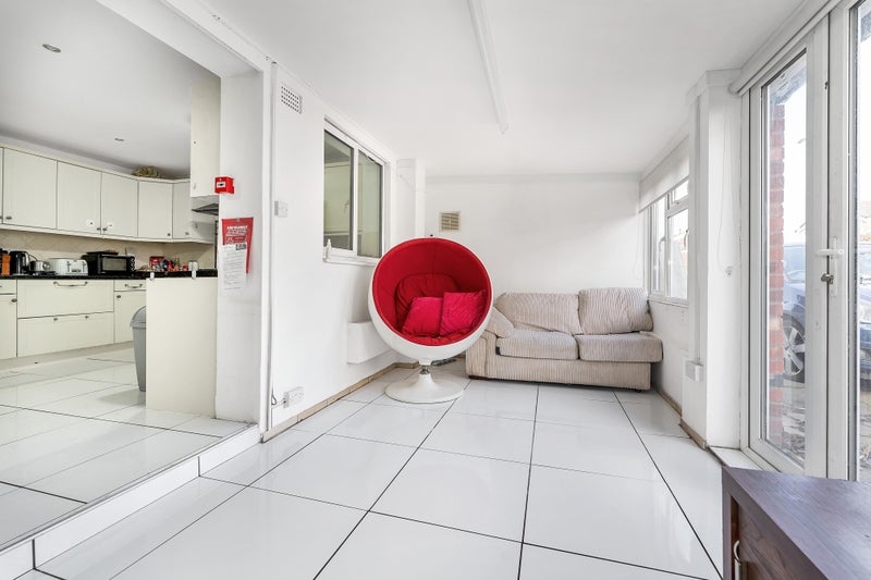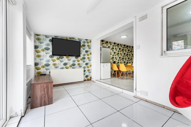 --- Studio room 2 (ground floor): 4.75m x4.60m (15'7 x 15'1). Super spacious with a high ceiling, it also offers dual aspect windows, letting in plenty of light. Three-door wardrobe, ottoman gas-lift storage double bed, massive gloss black desk, funky display unit and a sanctuary ball chair to hide away and get lost in your book. French double doors lead to the courtyard with the pond - an excellent view. TV point and sky point available in the room and the BT router is located in this room which means you always get the best wifi signal. Shares a bathroom on the ground floor with one other housemate. This room is taken.