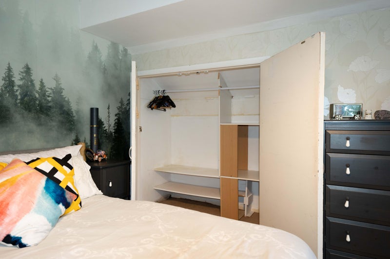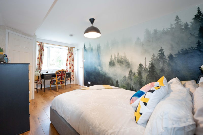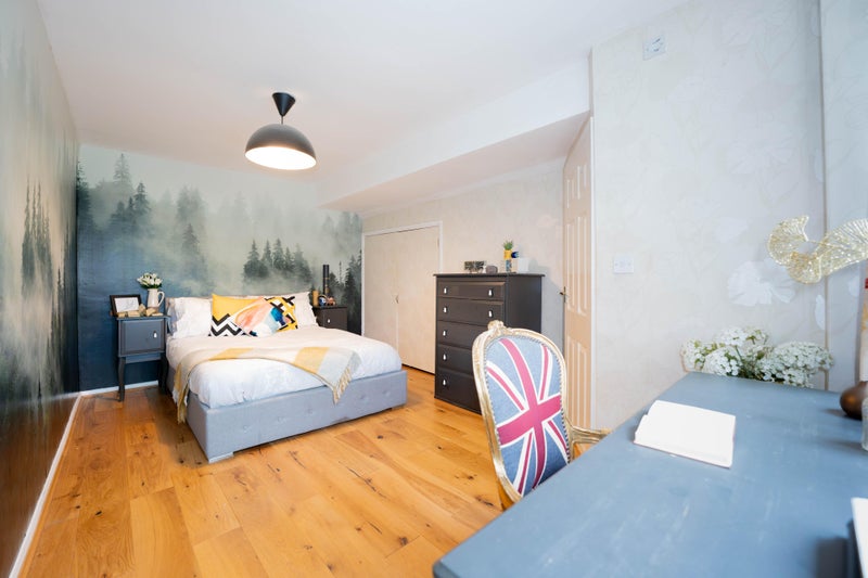 --- Large double room 4 (first floor): 4.72m x 2.51m (15'6x8'3), a shabby chic room with an elegant black feature wall, an ottoman gas-lift storage double bed, a cream French style wardrobe, a cream French style chest of drawers, a white desk with glass top and a Laura Ashley chair with jacquard fabric. There is also a built-in cupboard for extra storage. Shares a bathroom on the first floor with one other housemate. This room is available.