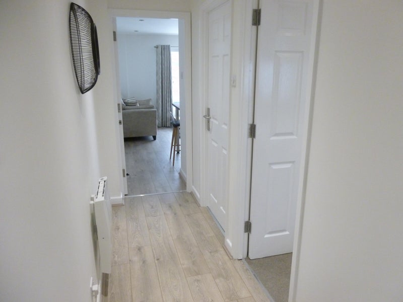 Situated on the first floor of a well-maintained, purpose-built development, the apartment offers a bright and contemporary open-plan living space. The stylish fitted kitchen features a convenient breakfast bar and is fully equipped with integrated appliances, including an oven, ceramic hob, fridge freezer, and washer dryer, perfect for modern, low-maintenance living.