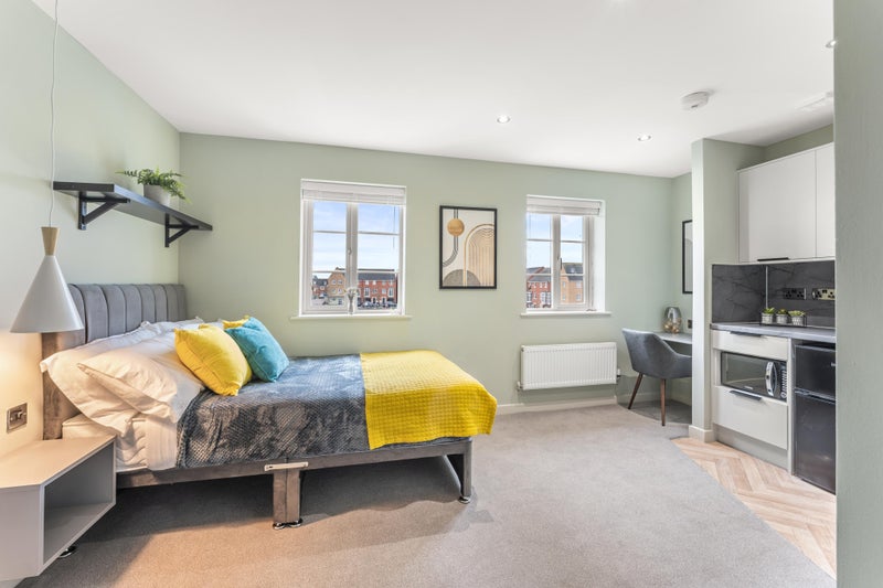 🏠 Located in the ever-popular area of Molyneux Square, Hampton Vale, this contemporary studio apartment offers modern, comfortable living in a vibrant community setting. Perfectly suited for a single professional or commuter, the property is fully furnished, featuring a cosy sleeping area with a double bed, a bespoke wardrobe, a desk and chair for working or studying, and a private en-suite bathroom.