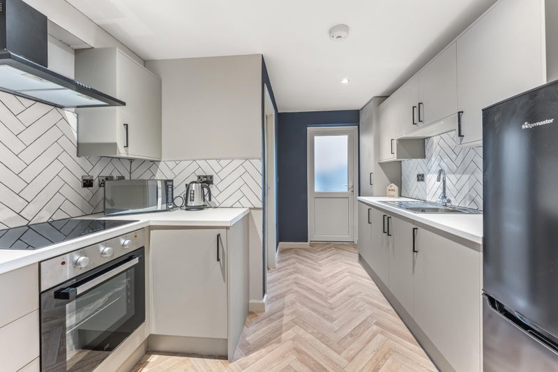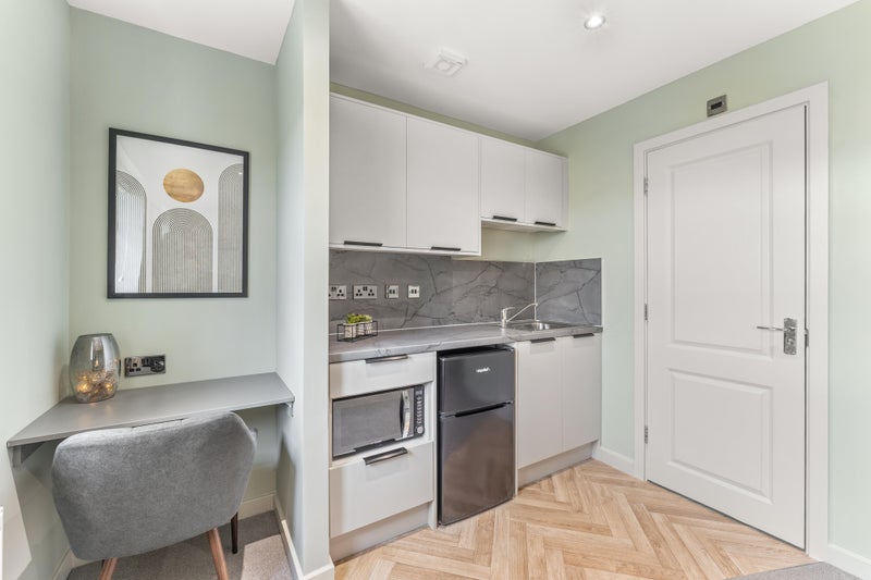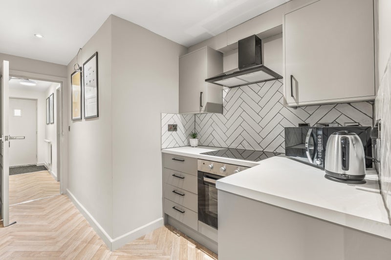 • Fully Equipped – Includes a kettle, microwave, and under-counter fridge/freezer.