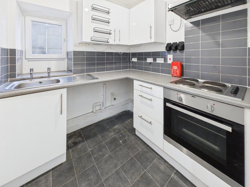 The separate kitchen is fitted with modern white base and wall units, complemented by sleek work surfaces. An integrated electric hob and oven are included, and there is dedicated space for both a washing machine and a fridge, making it a practical workspace for home cooking. A small window above the sink keeps the room bright and airy.