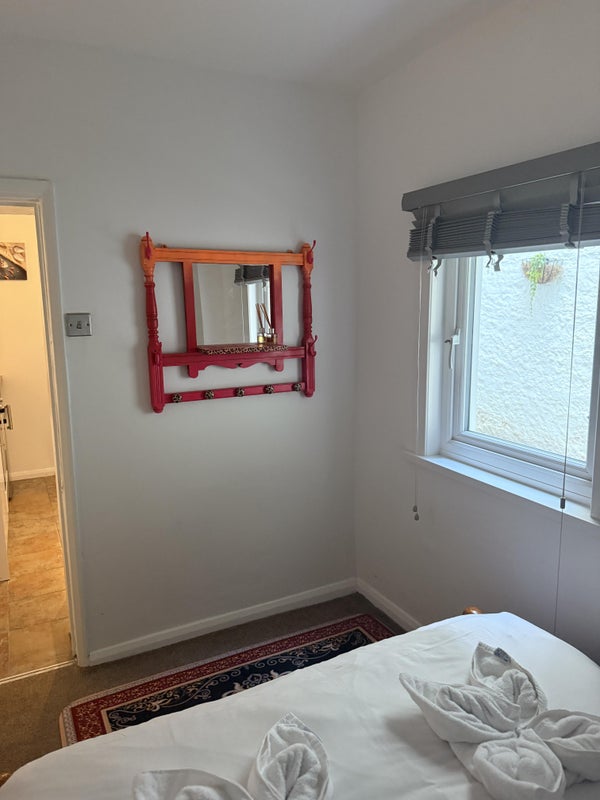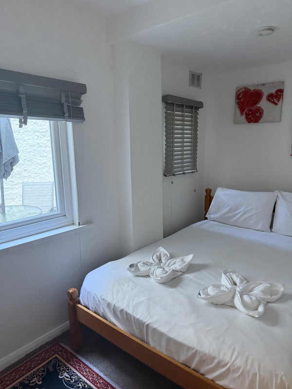 Your Room: Quiet double bedroom, with heating, newly fitted carpet and mattress, well-ventilated with two windows backing on to private terrace.