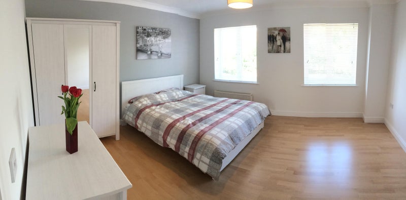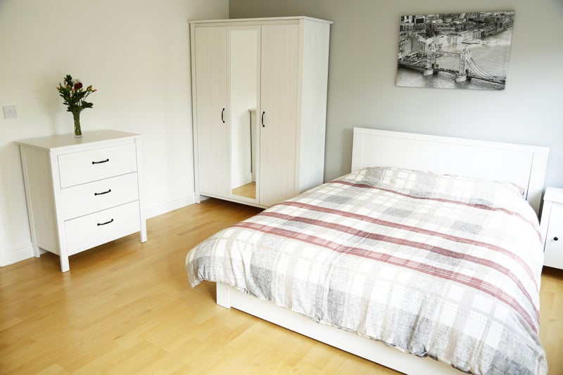 This fantastic room is furnished with a stylish, solid wooden double bed, high quality mattress (for a good night's sleep!), huge triple wardrobe, chest of drawer unit and a desk for home working, study and getting ready. You have an aerial point to connect your own TV if you so desire.