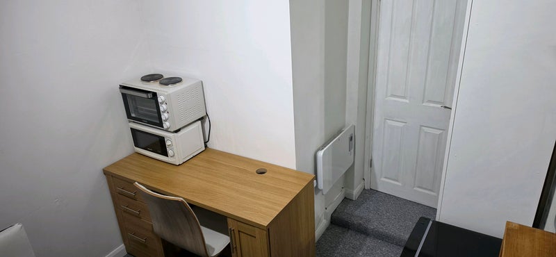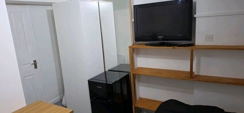 Small box room recently refurbished. The room in Fully furnished and has a fridge freezer, TV, firestick, Wifi, microwave, over, hob, and a wardrobe.