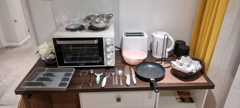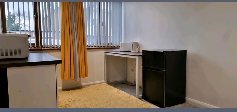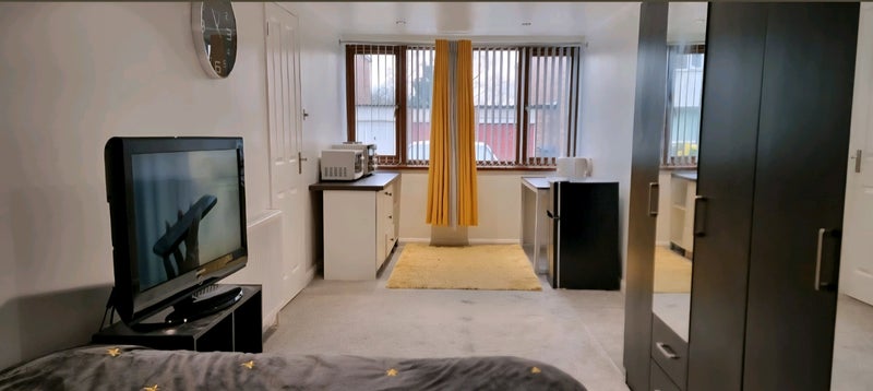 Large Bright spacious room with double bed. The room has plenty of storage space with 2 large wardrobes, fridge freezer, microwave, oven, hob, kettle, toaster and utensils. There is also a TV and firestick and includes high speed wifi.
