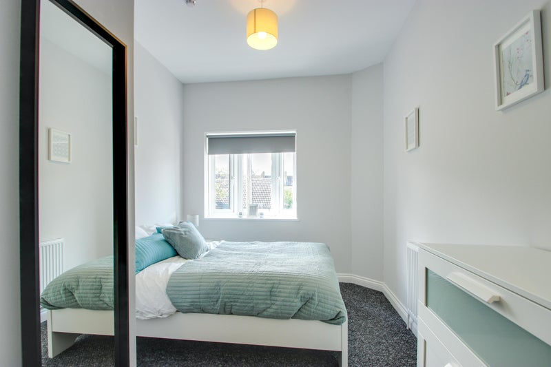 The rooms are furnished with a double bed, wardrobe, chest of drawers, bedside table desk and chair.