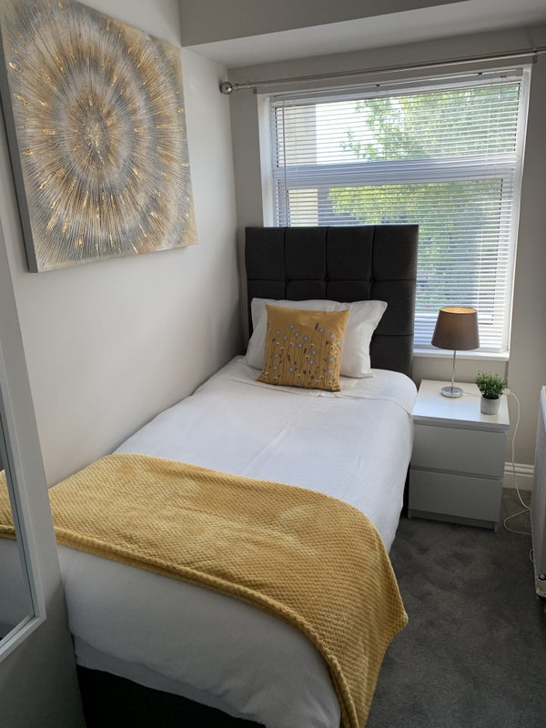 The room is furnished with a single bed with under bed storage, bedside cabinet,, wardrobe, chest of drawers, desk and chair, mirror and more...