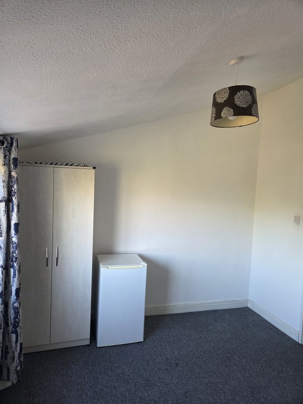 Clean and spacious furnished double room. Double bed, wardrobe, chest of drawers, small fridge and chair in the room.