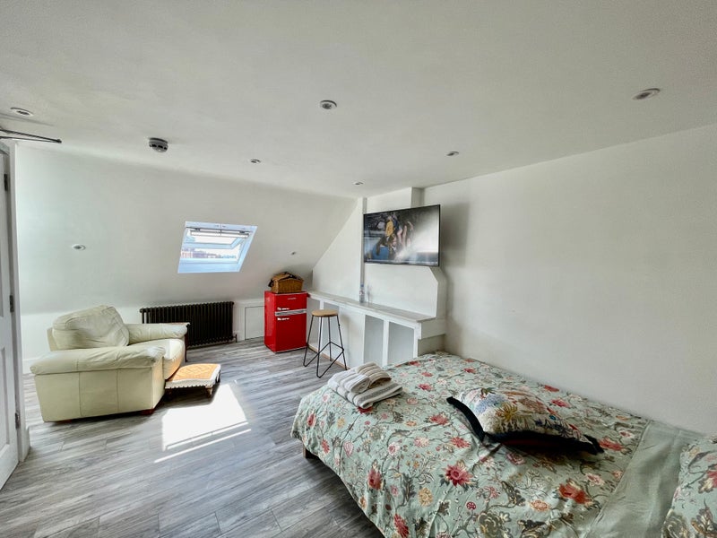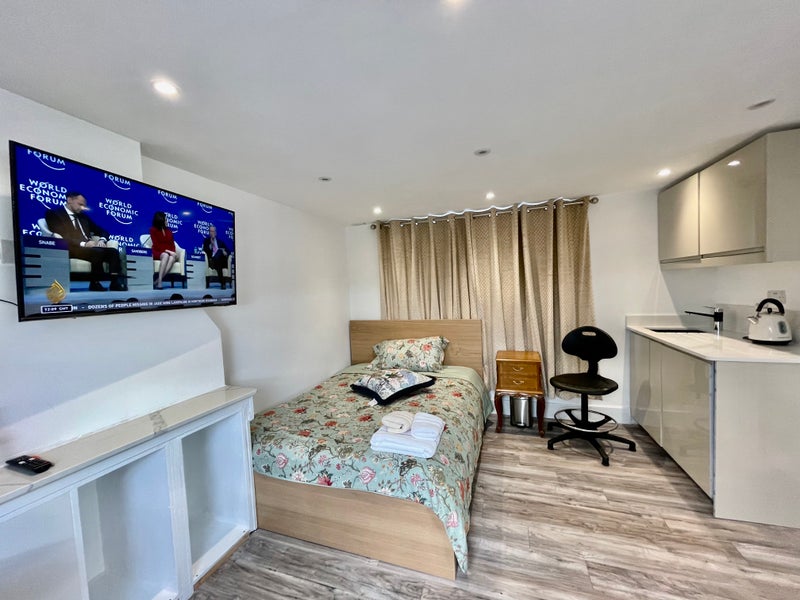 Double bed , strong Wi-fi, smart TV, working desk and chair, extra storage, quartz worktop, fridge freezer.. En-suite toilet with bidet, large shower, sink, mirror with bluetooth .