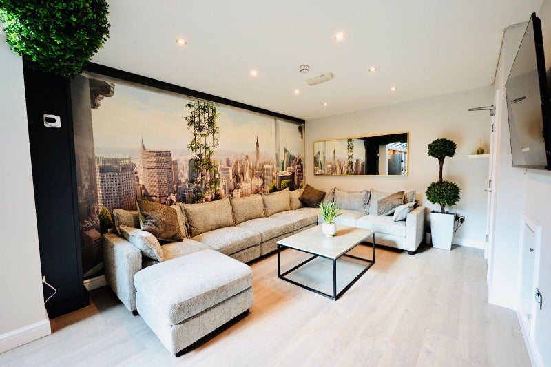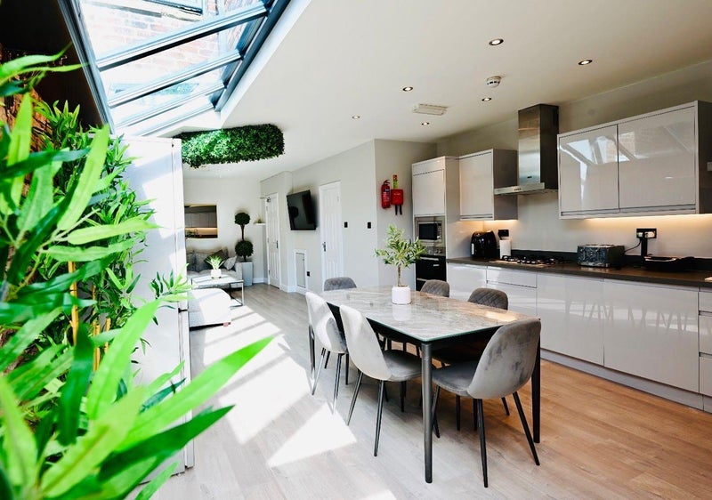 The open plan living and kitchen area is spacious with lots of natural light. Fully equipped with all mod cons, large wall mounted TV. Super fast broadband.