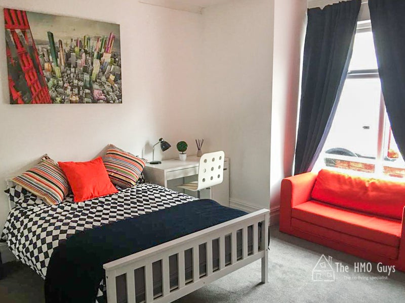 A refurbished five-bedroom house share on a quiet residential road in Swinton, just off the East Lancashire Road. Two rooms have a private en-suite; three rooms share a well-appointed bathroom with both a bath and a shower. The house has been done to a high standard throughout and is well maintained.