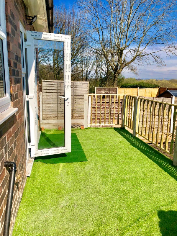 ▸ Decked garden with artificial grass, outdoor table and chairs — ideal for summer