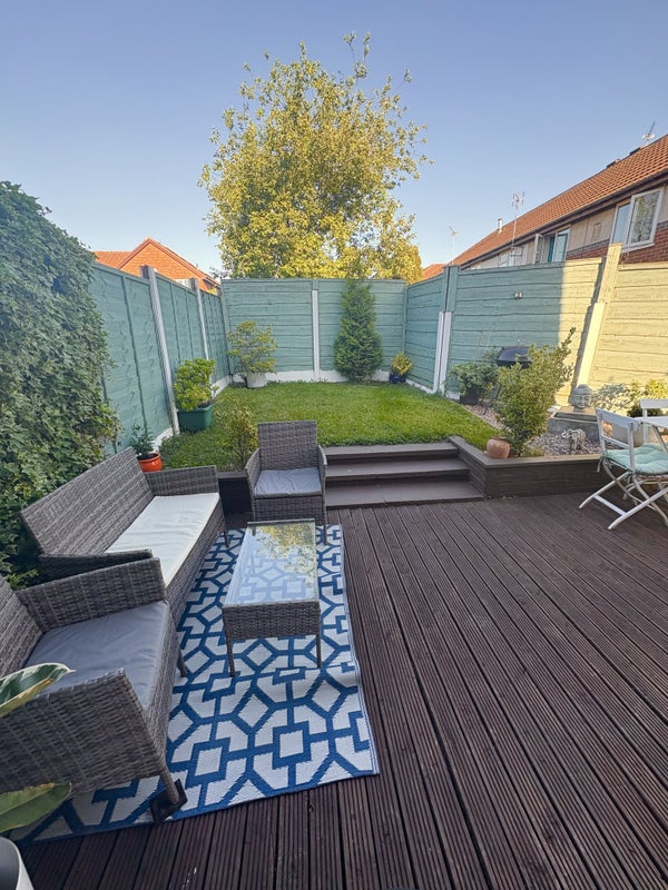 * Spacious garden with patio decking, outdoor seating, plants, and a shed
