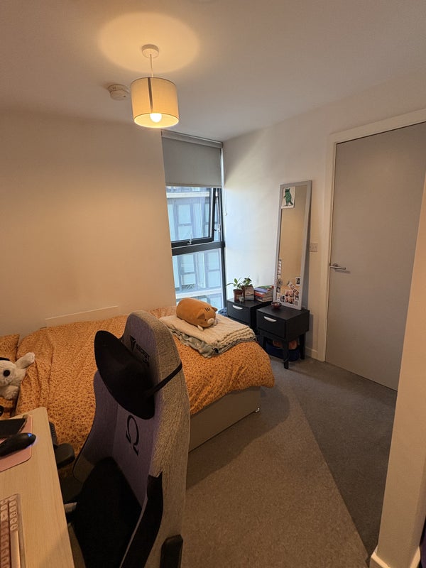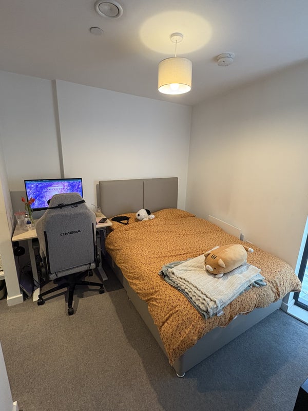 I have a spare room available at Vox apartments which is located in Cornbrook. It's a two bedroom flat, both with their own bathroom. The room available is the smaller of the two rooms but you'll have the bigger bathroom which also comes with a bath. I have pretty much everything here already, TV, kitchen appliances, etc., but of course you're welcome to bring your own things.
