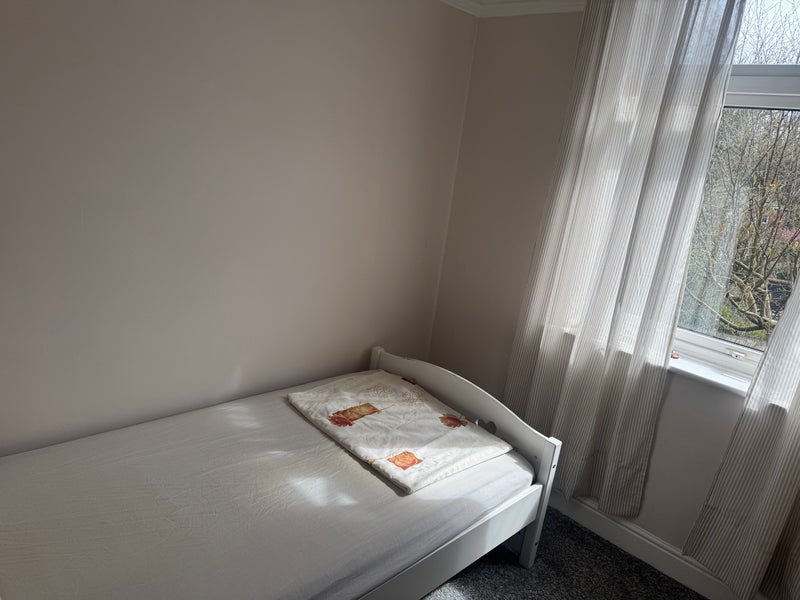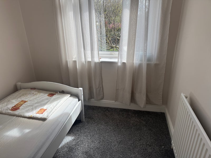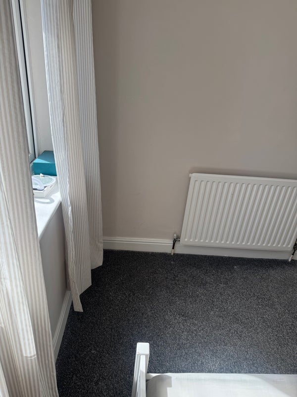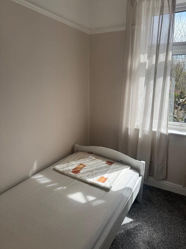 A small box room with a big window facing main road in a shared property with shared toilet and kitchen.