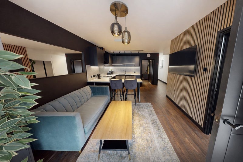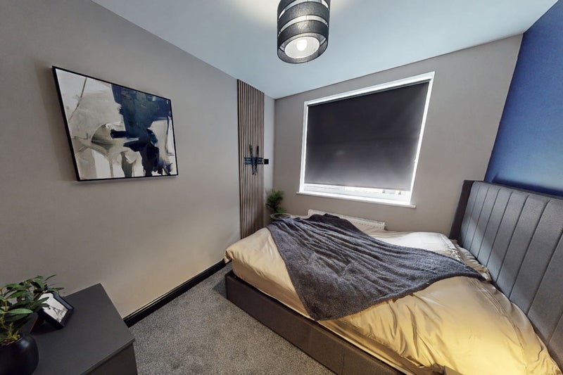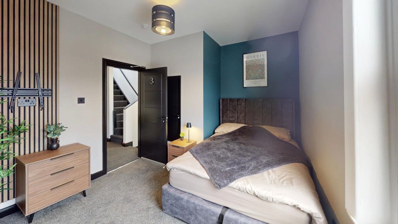 A bright, stylish space with a double bed, wardrobe, desk, and bedside table – everything you need to move in straight away.