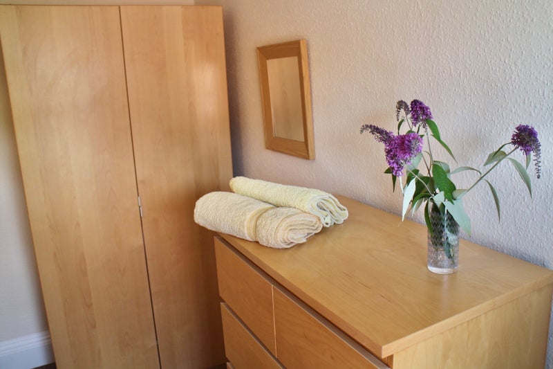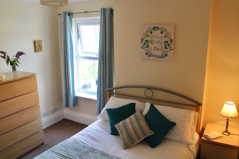 🛌 First floor double bedroom. It is fully furnished to include: comfy double bed and mattress , double wardrobe, chest of drawers & bedside table, desk and chair. Own TV aerial point, multiple electrical sockets and room has own plug-in internet point in addition to normal wireless high speed internet access.