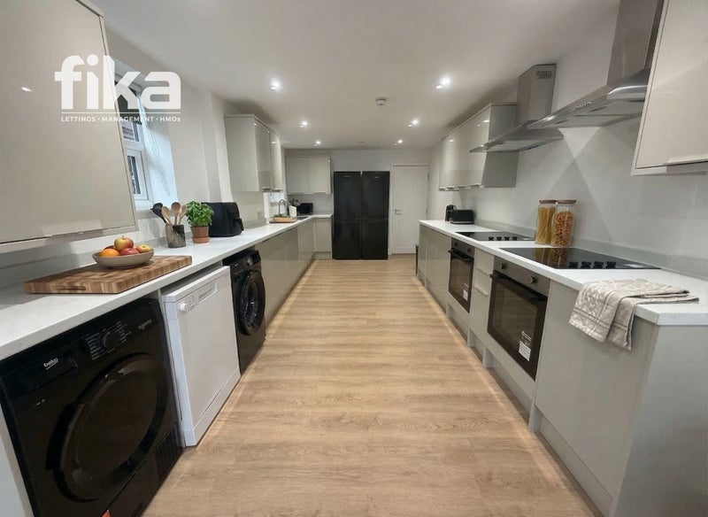 ✅ Modern and fully equipped kitchen with private cupboard space for each tenant, washing machine and tumble dryer, dishwasher, 2 ovens & hobs, dining table & chairs, sofa and smart TV