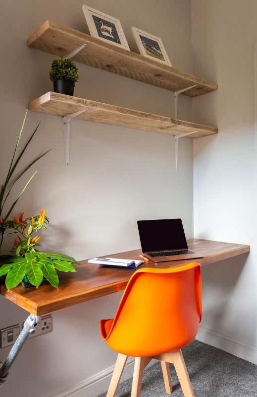 Furniture, includes double bed, solid wardrobe and bedside table, solid handmade desk space for working, shelves and hard wired Ethernet connection. Quality mattress.