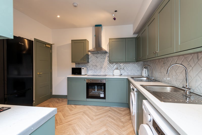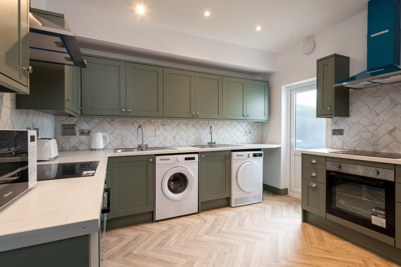 The kitchen has 2 hobs, 2 ovens, ample fridge and freezer space, with large private cupboards. A washing machine and Tumble Dryer.