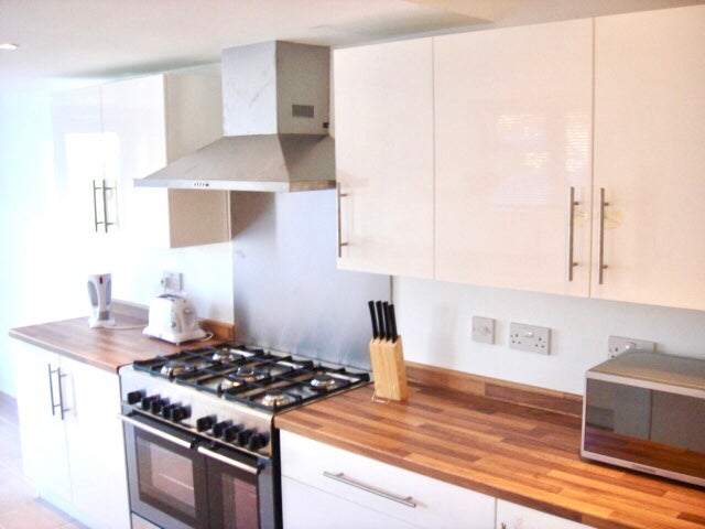 The kitchen has all the appliances you require including American fridge/freezer, range style cooker, microwave, washing machine, breakfast bar, dining table and all plates and utensils.