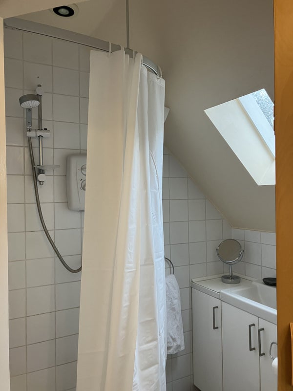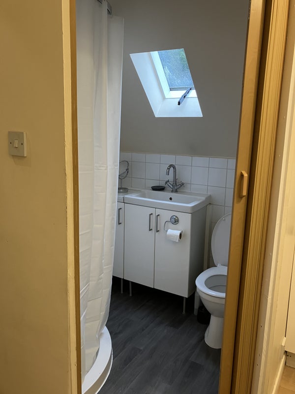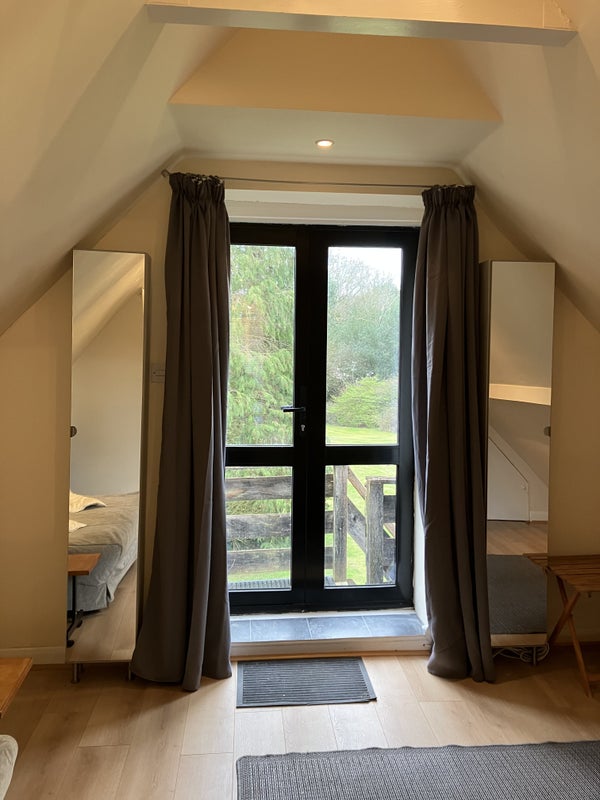 Self-contained first floor studio, with its own compact shower room and small kitchen. Part of a family home in a semi-rural location.