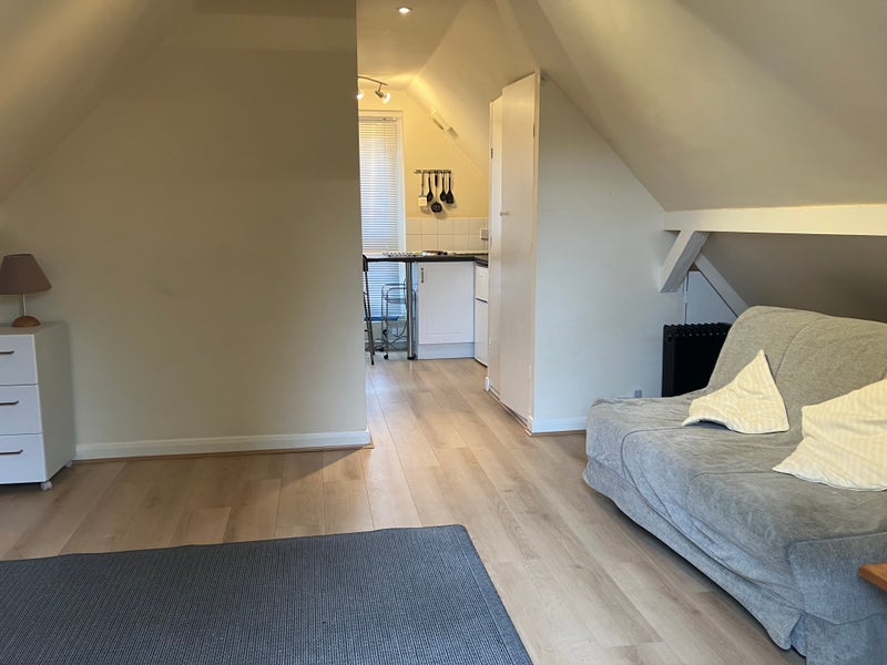 Bed-sitting area with Ikea sofabed. Good sized wardrobe. Galley kitchen with two ring hob, microwave/oven/grill, small fridge with freezer compartment. The kitchen is set up with crockery, cutlery, a kettle and toaster. Electric radiators provided.
