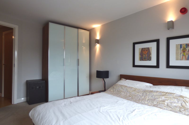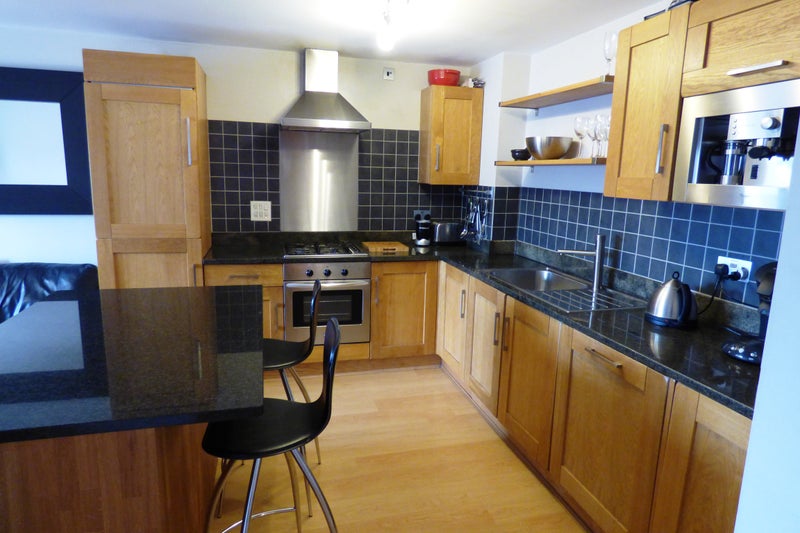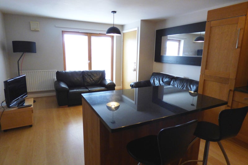 The apartment comes furnished. There is a spacious open plan living kitchen with ample units and a breakfast bar. Appliances include an integrated coffee machine, tall fridge freezer, oven and hob, washing machine, microwave and dishwasher. French windows with Juliet balcony flood light into the room.