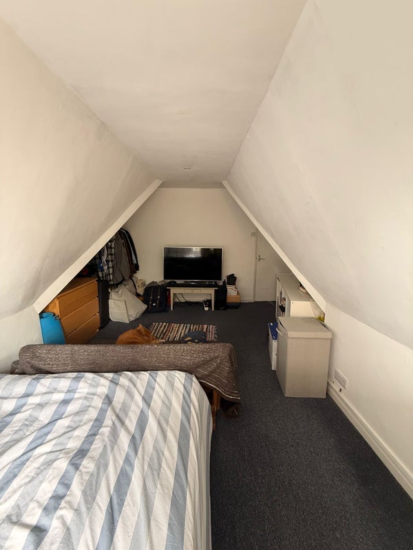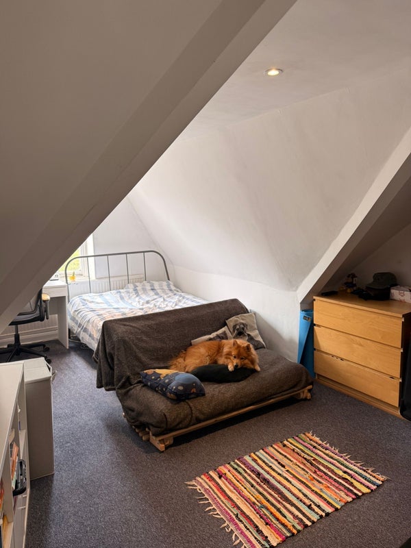 The room is a big attic room with sloped ceilings. The bed is included but otherwise unfurnished. Chest of drawers and cabinet can be negotiated.