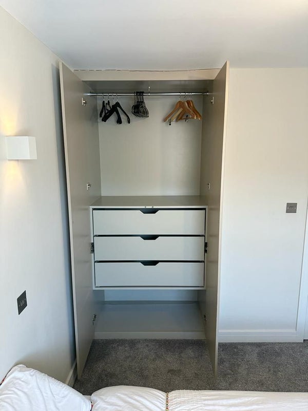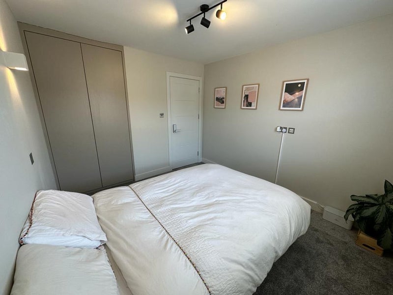 The room is a modern, double in a fully renovated 2-bedroom flat. The bedroom comes furnished as shown and with fitted built in wardrobes.