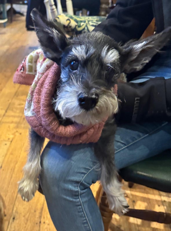 We also have a 16-year-old mini schnauzer rescue dog. She’s friendly, and has limited mobility (her hind legs are paralysed), so she uses a small wheelchair to get around. She wears a nappy 24/7, has no teeth left. She goes to work with us during the day, so she’s rarely at home during working hours.
