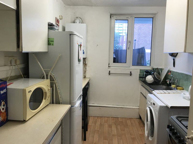 Fully furnished with a large bed, wardrobe, chest of drawers. Desk & Chair. Big windows, bright, clean and quiet. Fully fitted kitchen with gas cooker, oven, microwave, fridge & freezer etc.