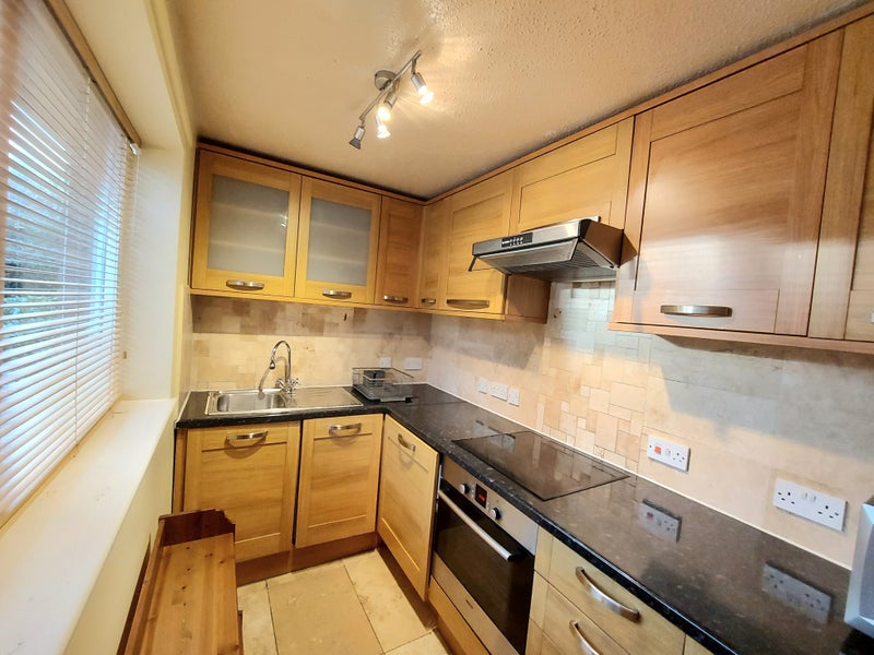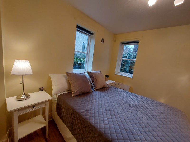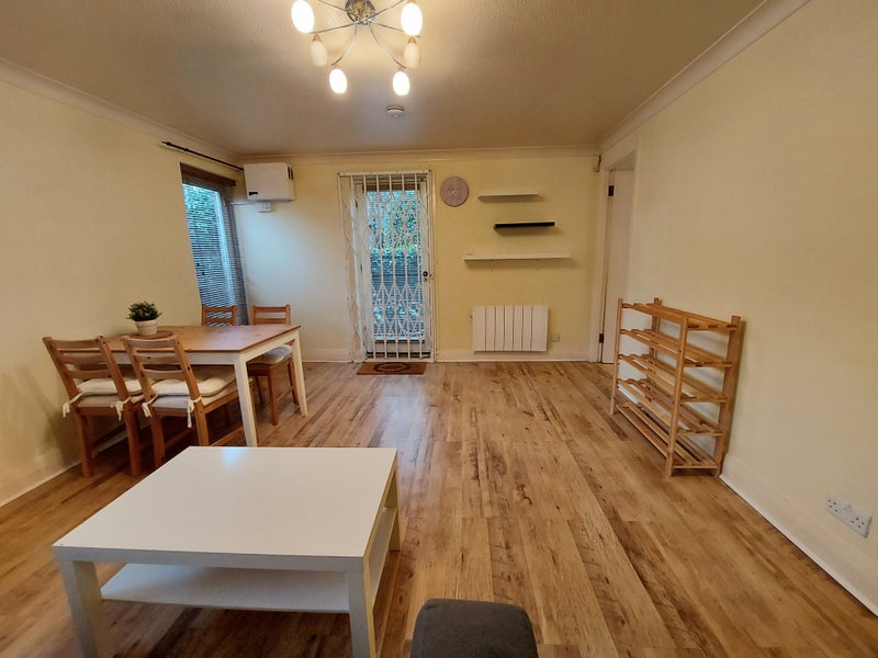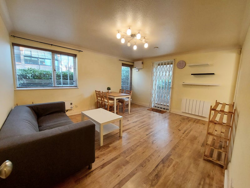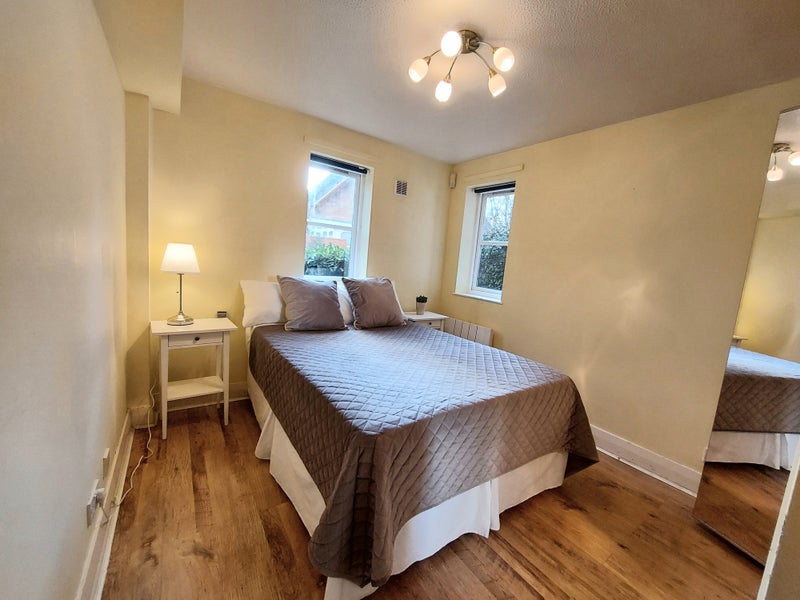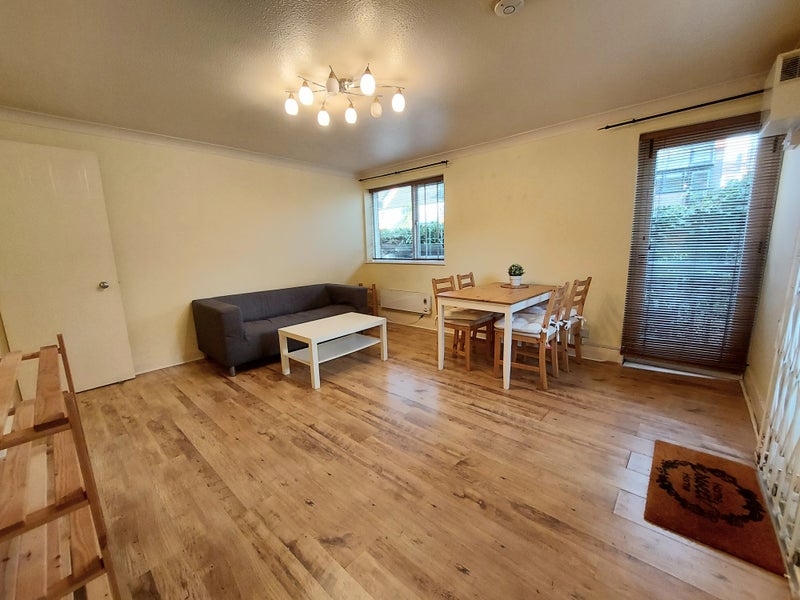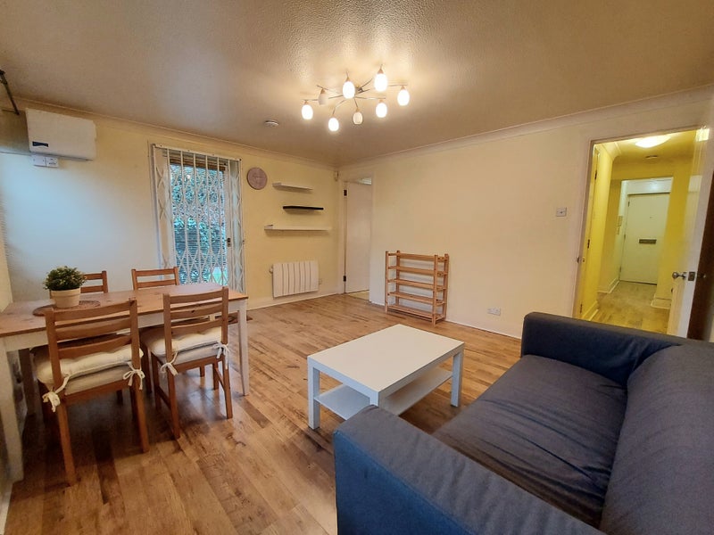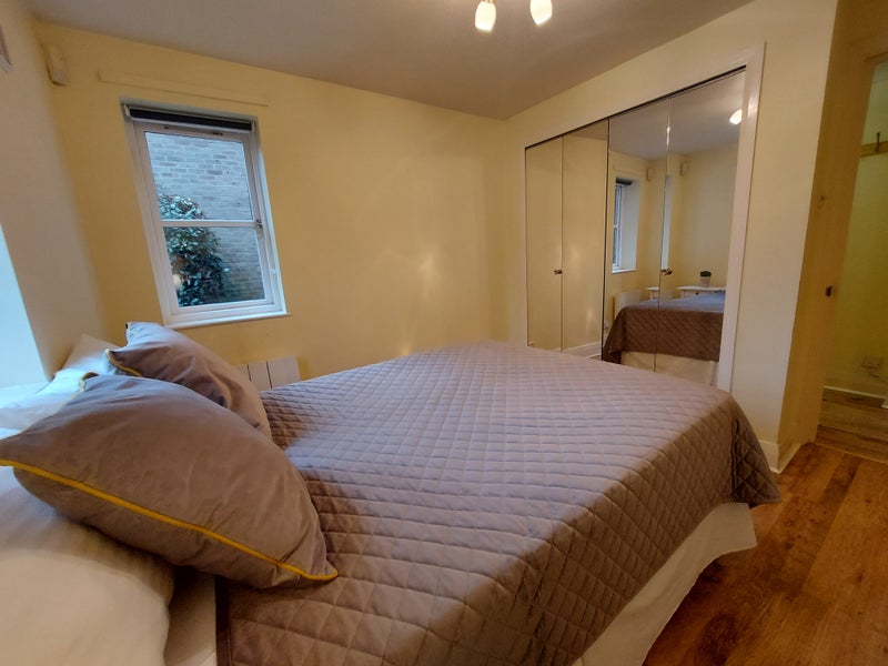 The apartment features a generous double bedroom with fitted wardrobes, a modern bathroom with bath and shower, and a bright, well-proportioned living area. The living room flows into a contemporary kitchen and provides access to a private garden—ideal for relaxing after a busy day. The property is offered fully furnished, ready for immediate move-in.