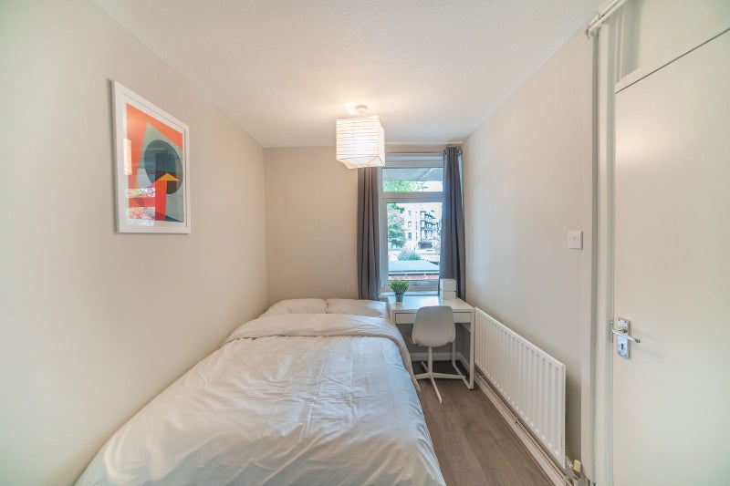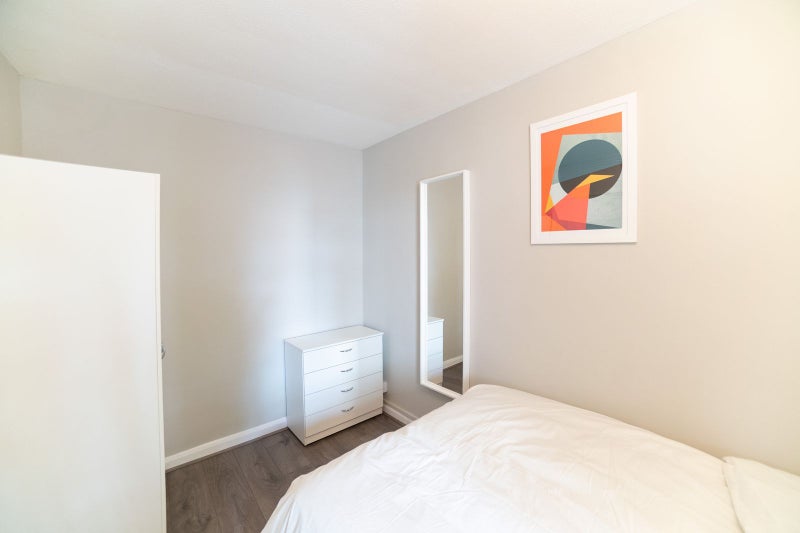 A well-proportioned, light-filled room complete with a double bed, wardrobe, desk and chair—ideal for both relaxing and working from home. The space feels bright and airy, making it a comfortable place to unwind.