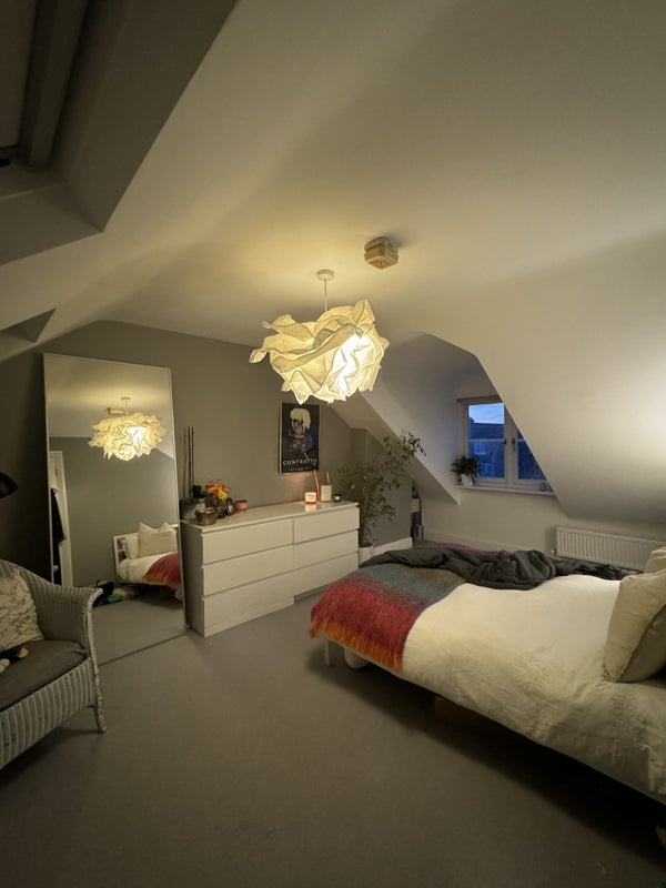 This space available is the entire top floor of a shared flat. This includes a large double bedroom, an office/lounge and a en-suite bathroom with a shower over the bath which is amazing in winter. The room comes furnished with a double bed and fitted wardrobe. All the additional furniture is available to buy (including a bedside table, two chest of drawers, a desk and desk chair, a TV stand, great sofa that pulls out into a double bed and bathroom storage all for £450) making it super easy if you are moving to London to walk into a ready to live space. There’s additional storage upstairs in the attic if needed!