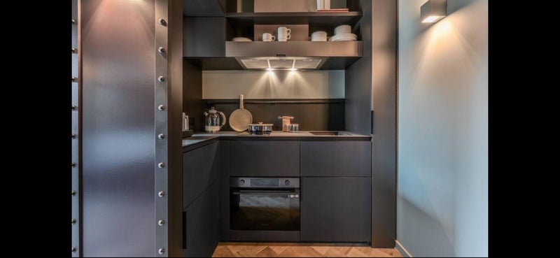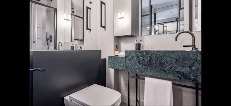 The sleek shower room features a marble sink and contemporary black fittings, and the integrated kitchen comes with modern smart appliances. It truly offers a boutique-hotel feel while still being practical and comfortable 🏡