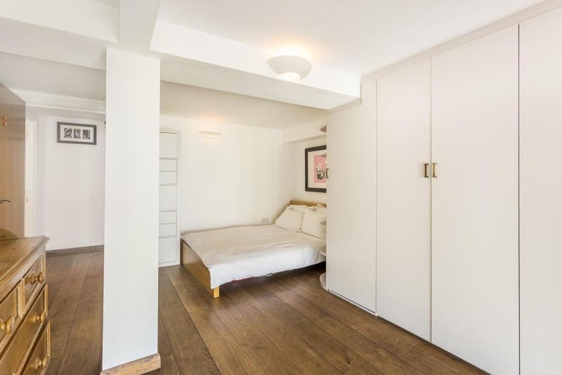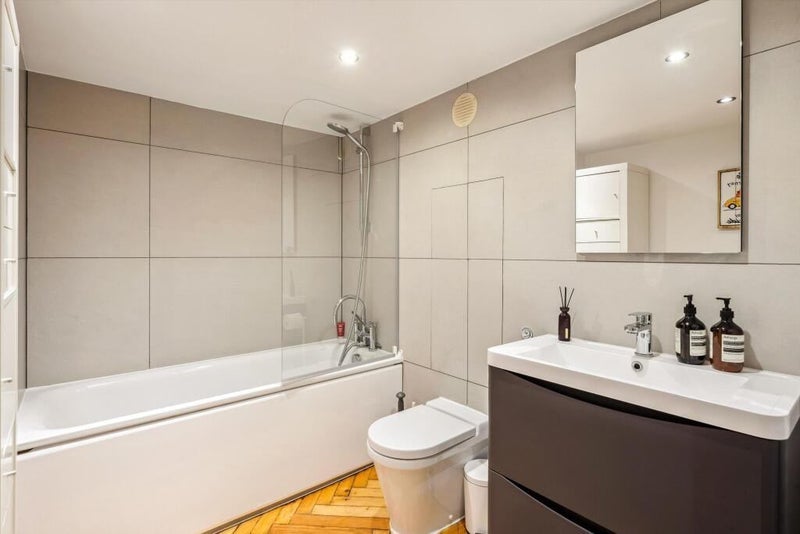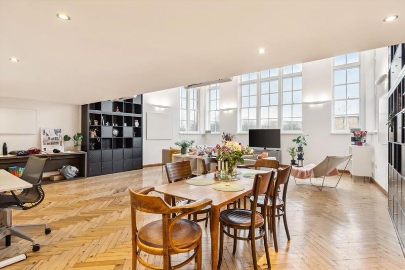 The flat comprises a generous open plan reception room which provides a fantastic living and entertaining space. It has parquet flooring and double height ceilings and benefits from an abundance of natural light through large sash windows.