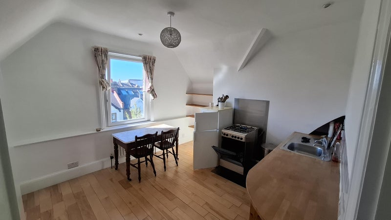 top floor pretty east facing bedroom with an en suite shower room, Overlooks large garden with many trees, birds and squirrels. Your own kitchen/ living room for your exclusive use. Quiet elegant early Victorian house. Only five minutes walk from Colliers Wood tube station. Quiet pretty street only two minutes from a small supermarket, and ten minutes walk from a very large one (Sainsburies and Marks and Spencer).