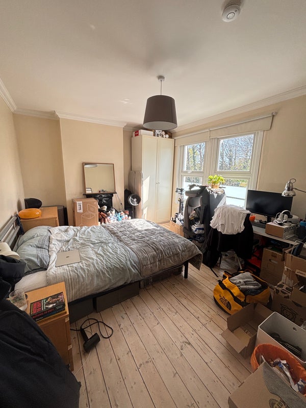The room is a spacious double fronted bedroom with wooden floorboards and a gorgeous fireplace. It is unfurnished but it does come with a big wardrobe (may be option to buy current housemates bed frame/mattress). The house has lovely shared living room and big kitchen with french doors onto garden and two fridges! We have a good sized garden with two patios and two storage sheds. We have one bathroom (with bath/ shower) between us but it works fine for us!
