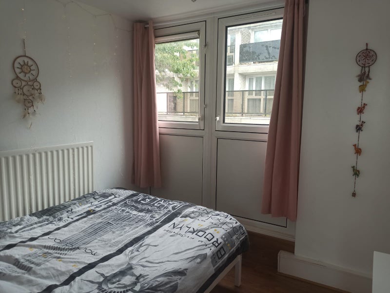 The bright single bedroom is in a quiet flat in Crystal Palace. The room is furnished with a single bed, wardrobe, chest of drawers, desk and chair.