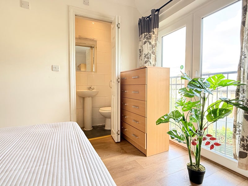 The room benefits from excellent natural light with balcony-style doors, creating an open and airy feel, along with a private ensuite bathroom (shower, WC, sink) for comfort and privacy.