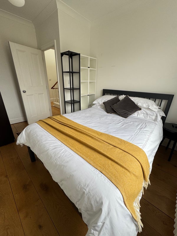 One double bedroom containing double bed, double wardrobe, shelves, bedside table, mirror and laundry basket available in a large house.