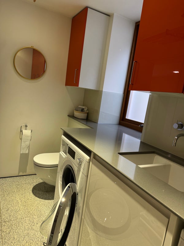 Utility room with washing machine, dryer, hanging racks, iron & ironing board and loo.