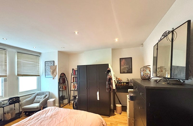 Room 1: A large double with a bay window on the lower ground floor. It comes with a king size ottoman bed frame (no mattress) and a wardrobe.